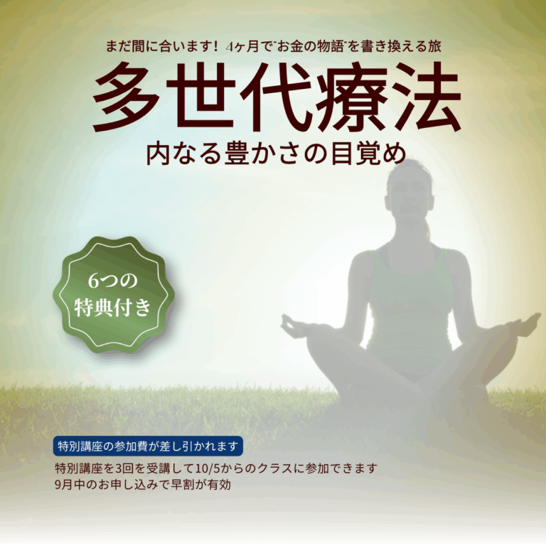 特別講座「MONEY, LIFE, ME」の参加費が、「多世代療法〜内なる豊かさの目覚め」より差し引かれます💡